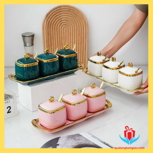 - 3 hủ gia vị bằng sứ màu hồng viền vàng